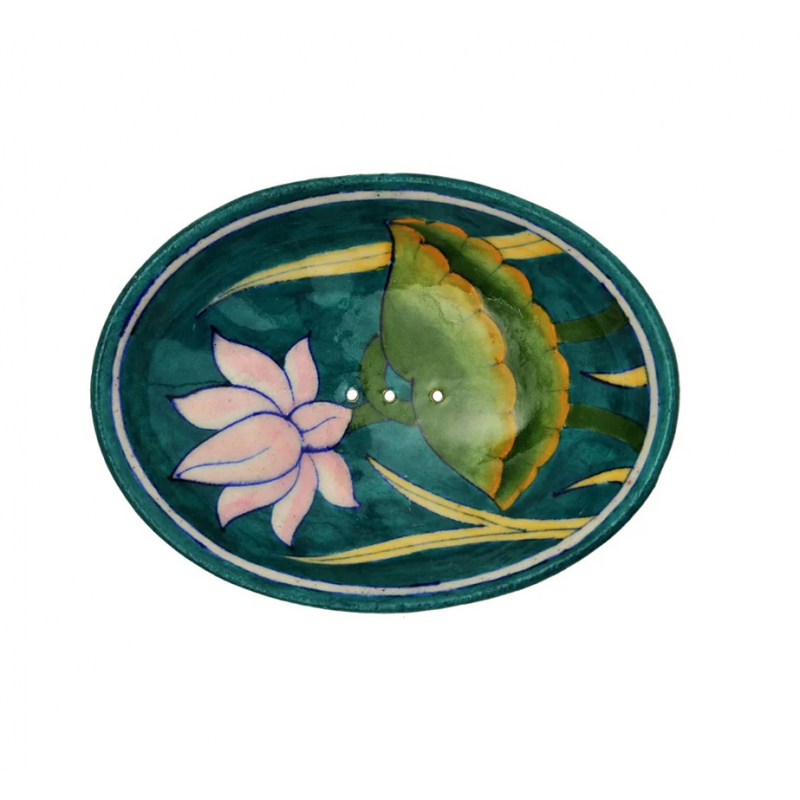 Handgefertigte Blue Pottery Seifenschale mit floralem Print in türkis aus hochwertiger Keramik. Das ovale Design mit praktischen Wasserablauf-Löchern sorgt dafür, dass deine Seife immer trocken bleibt. Unterstütze mit diesem fair produzierten und nachhaltigen Bad-Accessoire die traditionelle Töpferkunst aus Jaipur.