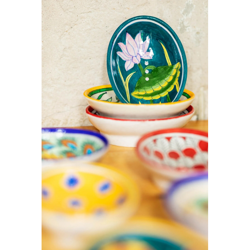 Die handgefertigte Blue Pottery Seifenschale in Türkis mit floralem Print bringt authentische indische Töpferkunst direkt in Ihr Badezimmer. Jeder Artikel wird mit viel Liebe zum Detail hergestellt und bewahrt so jahrhundertealte Traditionen. Mit dem Kauf unterstützen Sie die Lebensgrundlage zahlreicher Handwerker in Jaipur.