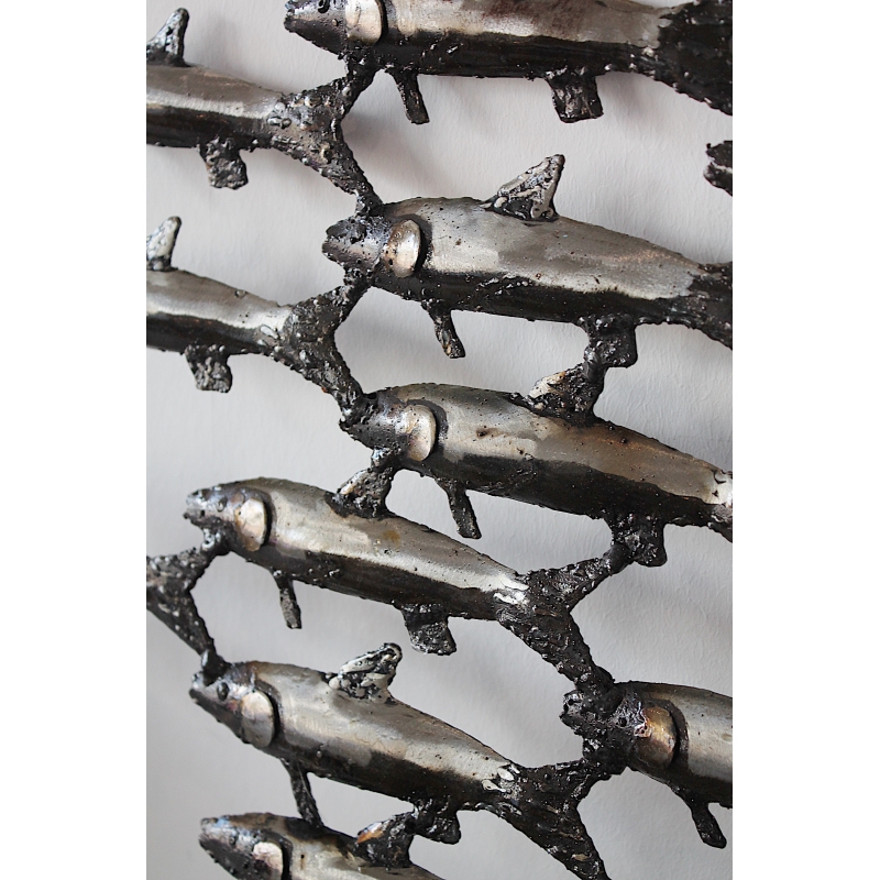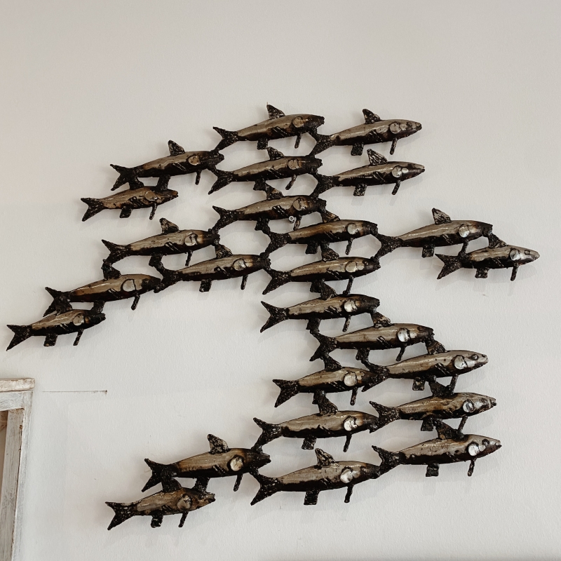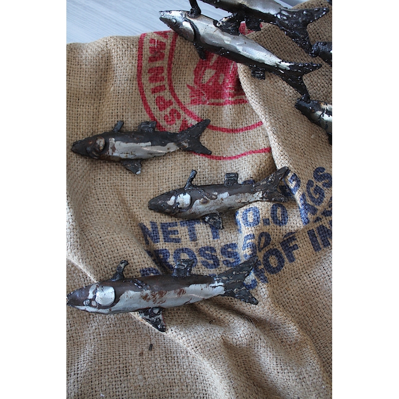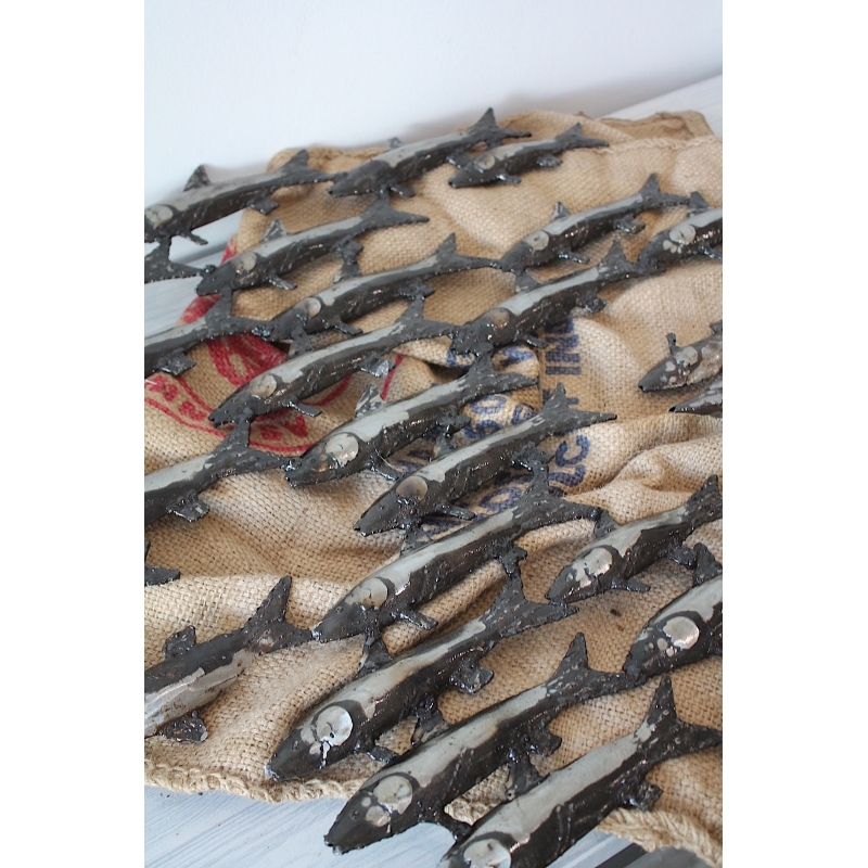 Ein echter Hingucker für Ihre Wand: unser Sardinen-Fischschwarm, gearbeitet aus recyceltem Metall. Der Fischschwarm überzeugt durch seine hohe Qualität: er wurde per Handarbeit gefertigt und ist sehr robust. Der Schwarm wird ergänzt durch drei einzelne Fische, die ebenfalls mitgeliefert werden.