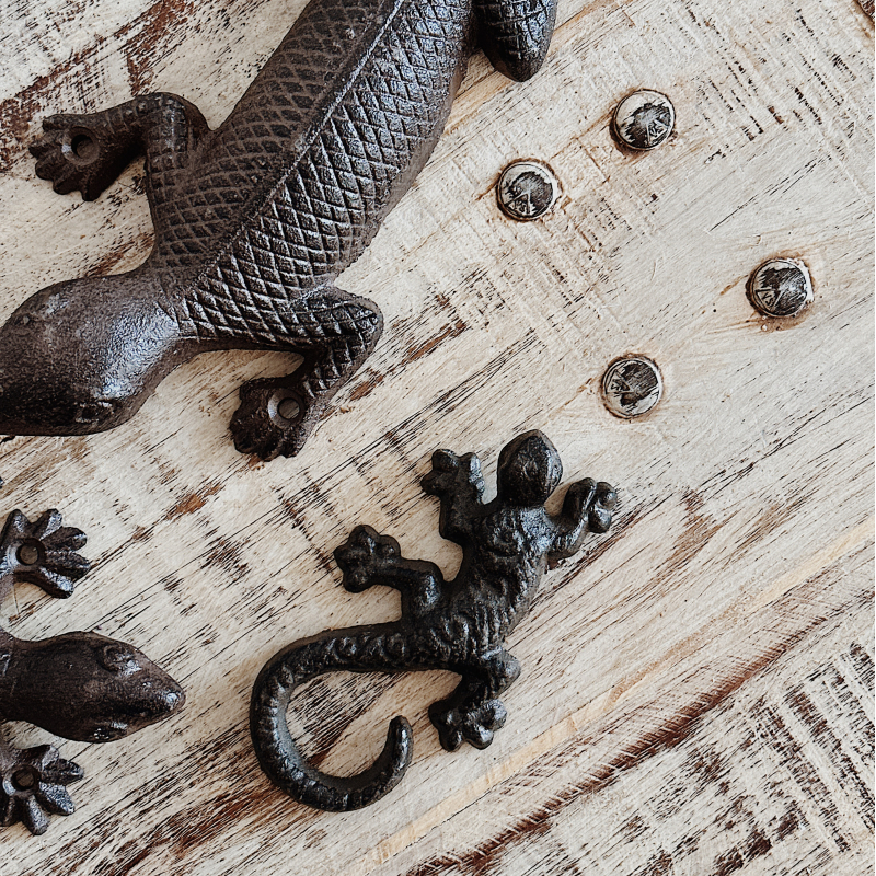 Entdecken Sie unsere Eidechse-Figur aus Gusseisen in drei verschiedenen Größen (Hier: Klein 11,5 cm, Mittel 17 cm, Groß 28,5 cm) in toller Vintage-Optik.